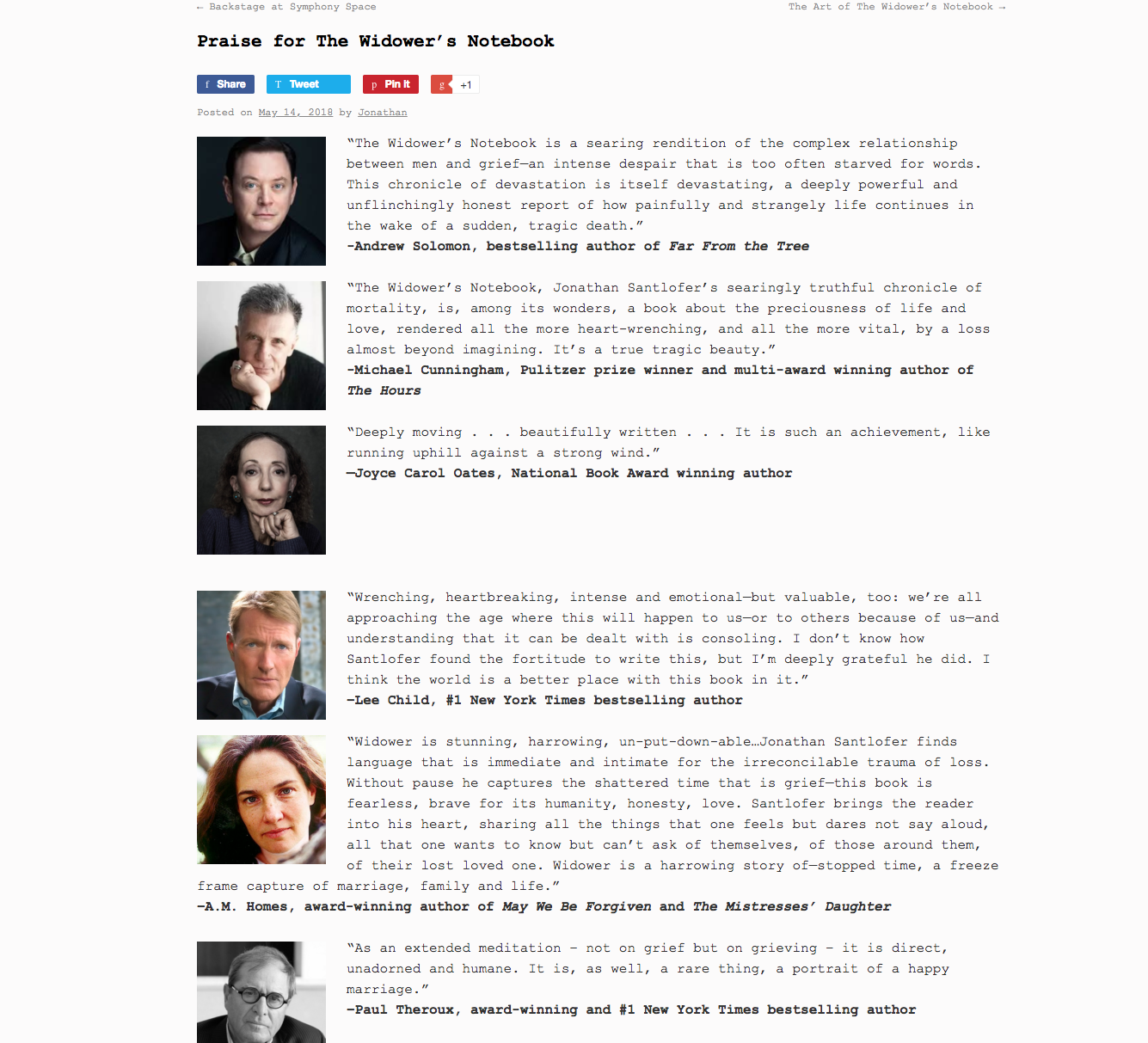 “The Widower’s Notebook is a searing rendition of the complex relationship between men and grief—an intense despair that is too often starved for words. This chronicle of devastation is itself devastating, a deeply powerful and unflinchingly honest report of how painfully and strangely life continues in the wake of a sudden, tragic death.” -Andrew Solomon, bestselling author of Far From the Tree “The Widower’s Notebook, Jonathan Santlofer’s searingly truthful chronicle of mortality, is, among its wonders, a book about the preciousness of life and love, rendered all the more heart-wrenching, and all the more vital, by a loss almost beyond imagining. It’s a true tragic beauty.” -Michael Cunningham, Pulitzer prize winner and multi-award winning author of The Hours “Deeply moving . . . beautifully written . . . It is such an achievement, like running uphill against a strong wind.” —Joyce Carol Oates, National Book Award winning author “Wrenching, heartbreaking, intense and emotional—but valuable, too: … Read more