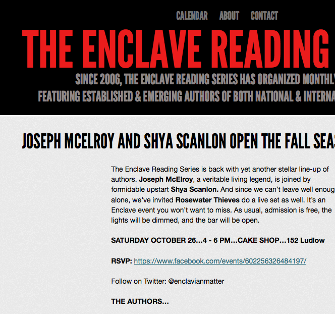 I will be reading at the Enclave Reading Series on the LES, Saturday, November 16, 4-6pm. Details are below, with one missing detail, the theme: “transgression.” You have been warned. But I’d rather embarrass myself in front of a large crowd than a small one, so I hope you will come…